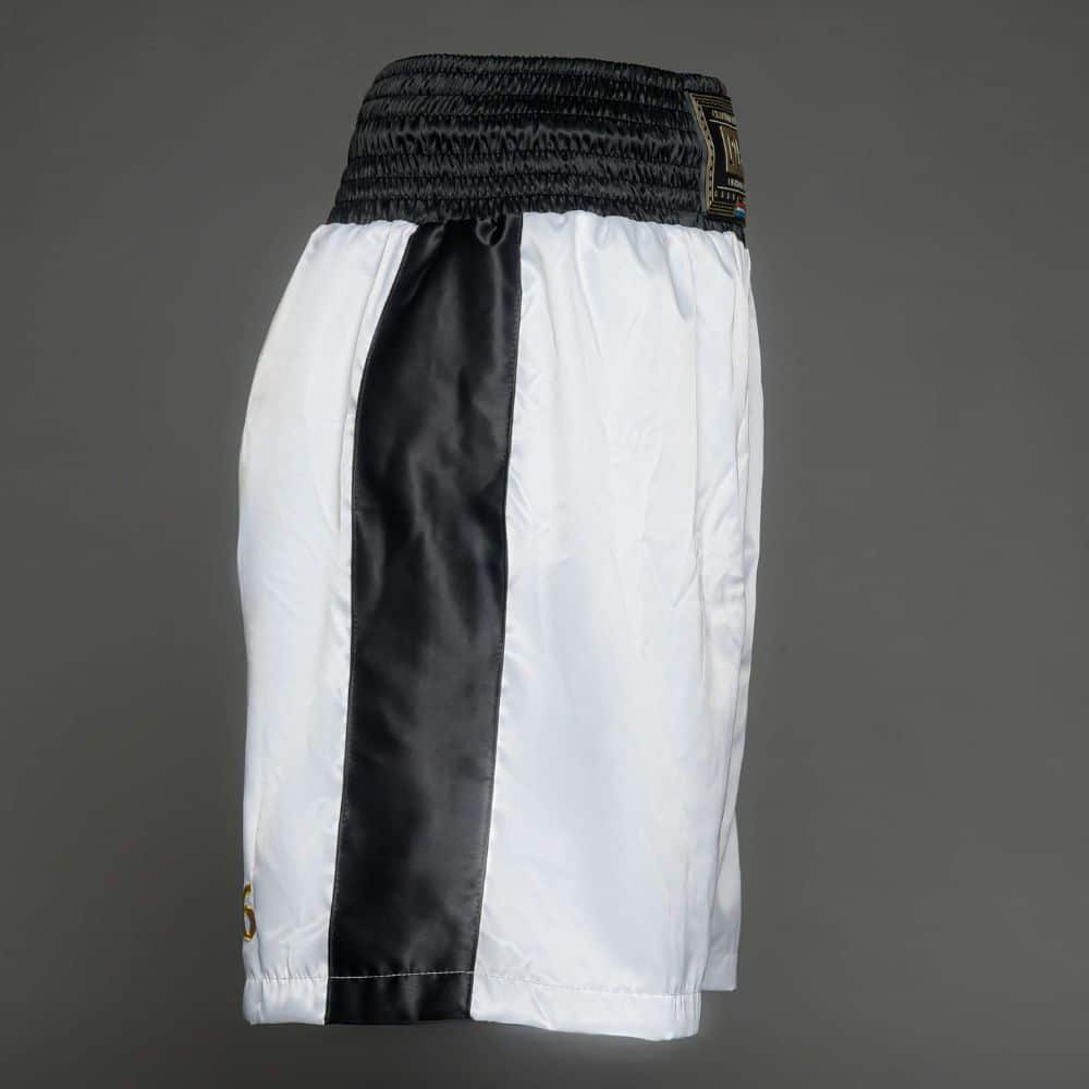 De broek is gemaakt van satijn, wat zorgt voor een soepele pasvorm en maximale bewegingsvrijheid in de ring. De brede elastische tailleband houdt de broek stevig op zijn plek, zelfs tijdens intensieve rondes. De klassieke witte kleur met zwarte zijstrepen en het gouden 1916-logo geven deze broek een professionele look.