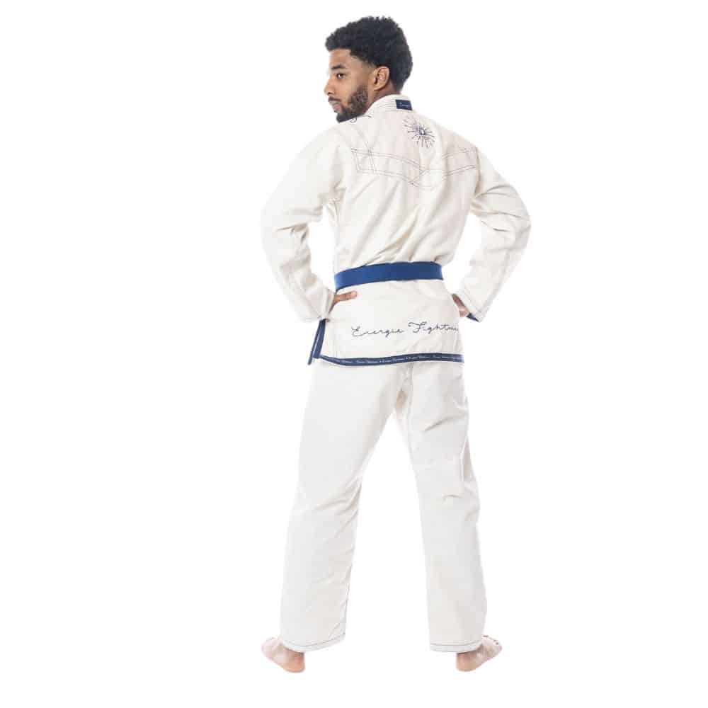 Een unieke gi, van ongebleekt katoen, met veel details en met een verhaal er achter. Voor destof kozen we een lightweight 350gsm weave om te compenseren voor de inside lining. Alsof je een zijde kimono aantrekt dus!