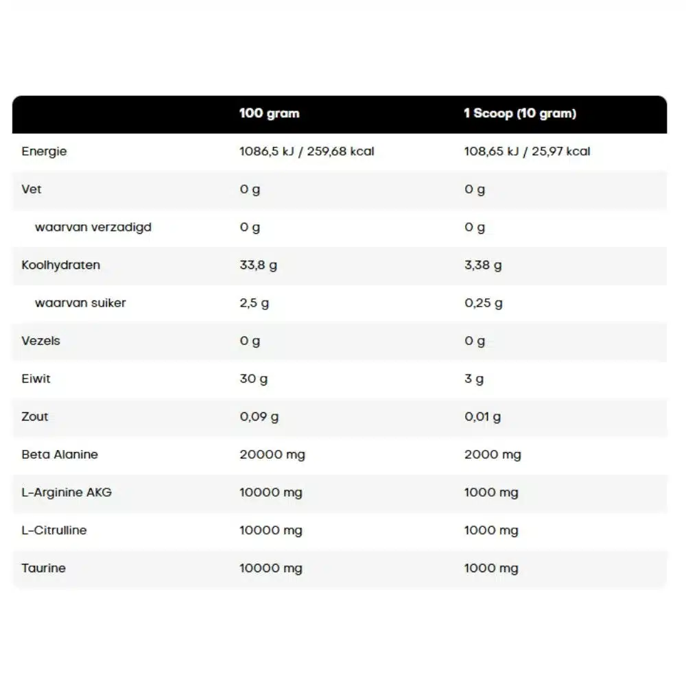 • Belangrijkste ingrediënten: Citruline malaat, beta alanine, taurine en arginine AKG